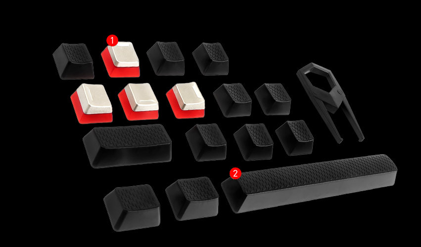 Unikatowe, wykonane ze stopu cynku nakładki na klawisze zapewniają absolutny komfort pracy i gry.2. Wymienne nasadki klawiszy z podwójnie nanoszoną gumową powłoką