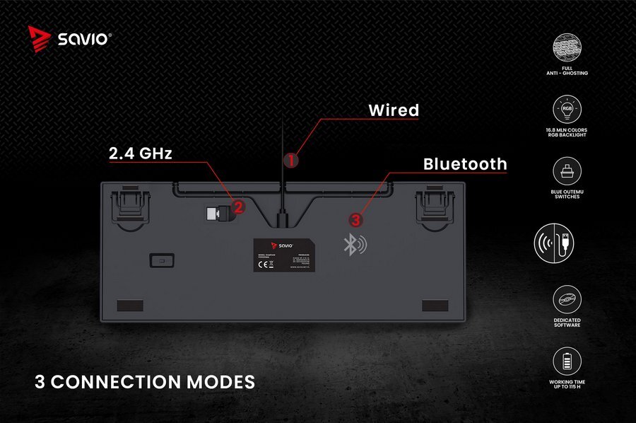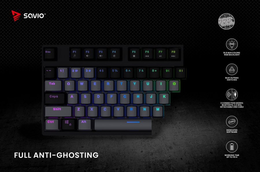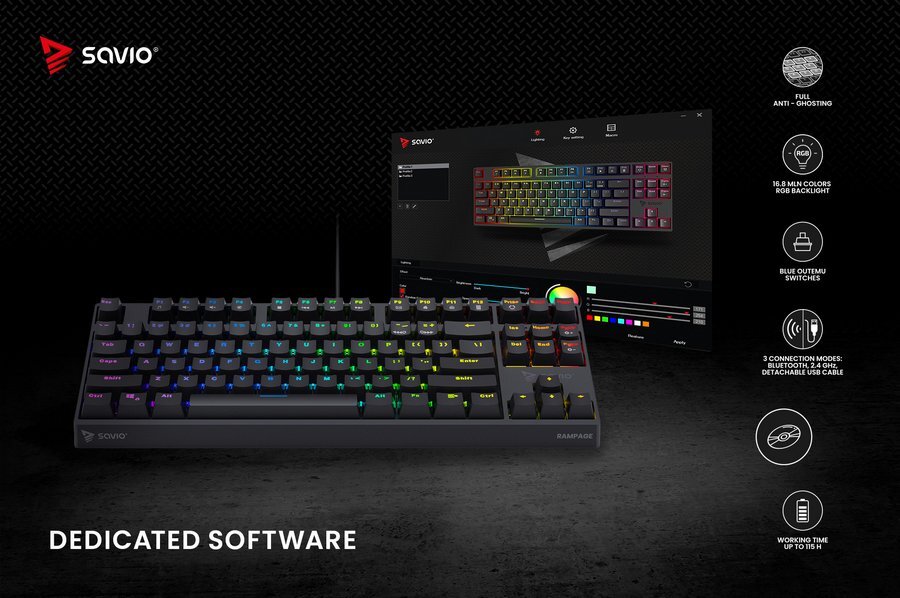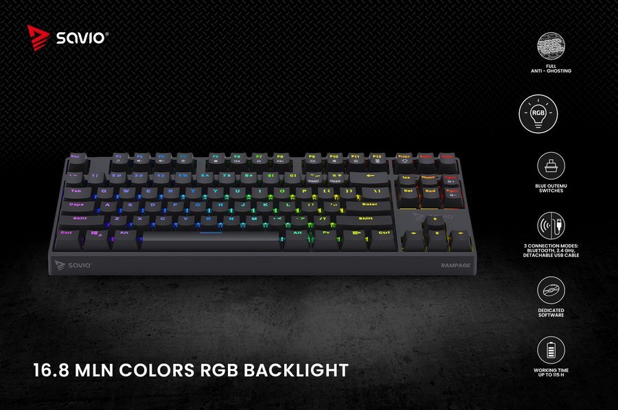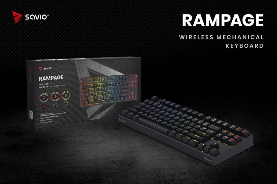 SAVIO RAMPAGE to bezprzewodowa klawiatura mechaniczna stworzona z myślą o graczach, świetnie sprawdzi się zarówno w warunkach domowych, jak i na turniejach. Nakładki na klawisze zostały wykonane w technologii „double-injection”, co zapobiega ścieraniu się znaków podczas ich użytkowania, a żywotność przełączników wynosi aż do 50 000 000 kliknięć. W dobraniu właściwego kąta nachylenia pomogą także dwustopniowe, gumowane nóżki, które umożliwiają ustawienie klawiatury na trzech różnych wysokościach podparcia. Klawiatura posiada także możliwość poprowadzenia kabla w trzech kierunkach, tym samym dostosowując się do preferencji i wygody każdego gracza.
