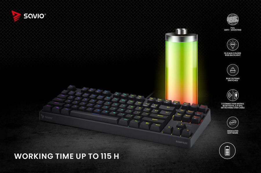 Klawiatura Rampage została wyposażona w pojemny i wytrzymały akumulator, który umożliwia stabilną pracę podczas długich rozgrywek. W trybie wyłączonego podświetlenia klawiatura działa aż do 115 godz., podczas korzystania ze stałego podświetlenia umożliwia pracę do 30 godz. W trybie RGB wraz ze zmiennymi kolorami do 14 godz. Zaimplementowana innowacyjna funkcja Eco, znacząco wydłuża działanie klawiatury, poprzez wyłączanie podświetlenia po 10 sek. bezczynności.