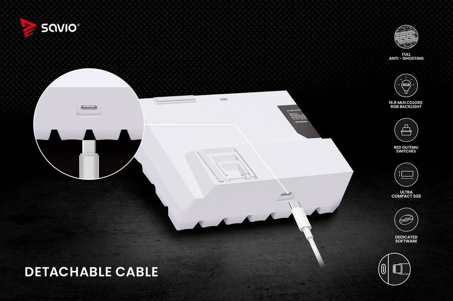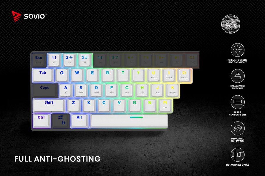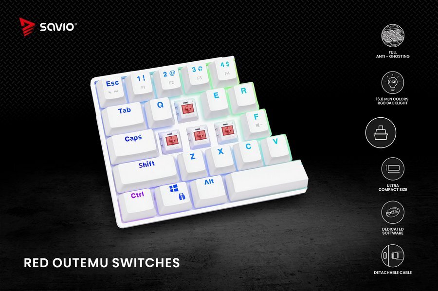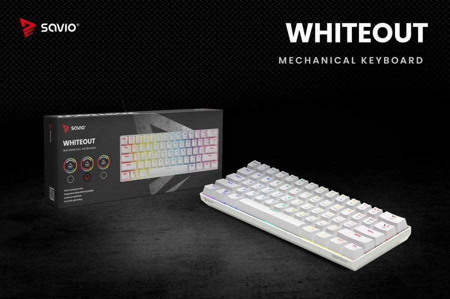 SAVIO WHITEOUT to klawiatura mechaniczna, która świetnie sprawdzi się zarówno w warunkach domowych, jak i na turniejach. Stworzona została z myślą o najbardziej wymagających użytkownikach. Nakładki na klawisze zostały wykonane w technologii „double-injection” co zapobiega ścieraniu się znaków podczas ich użytkowania, a żywotność przełączników wynosi do 50 000 000 kliknięć. Dodatkowo dwustopniowe nóżki umożliwiają ustawienie klawiatury na trzech różnych wysokościach podparcia, tym samym dostosowując się do indywidualnych preferencji każdego gracza. Ma to na celu właściwe i komfortowe ułożenie nadgarstków.