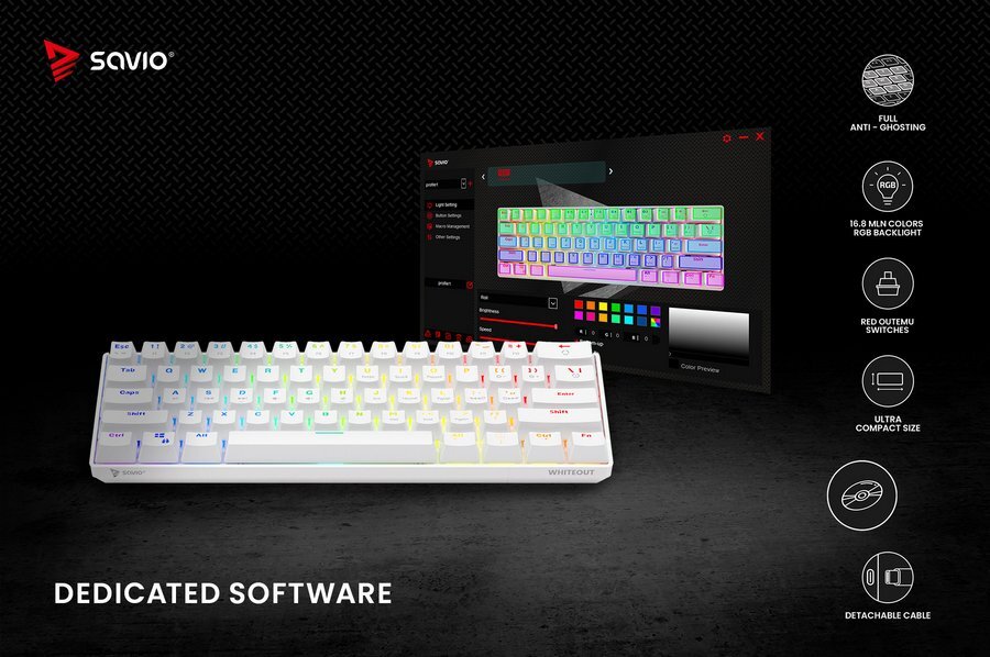 Do klawiatury WHITEOUT stworzono dedykowane oprogramowanie, dzięki któremu masz dostęp do zaawansowanych funkcji takich jak ustawienia makro, konfiguracja podświetlenia czy też tworzenia własnych profili dla gier. Dodatkowo klawiatura posiada wbudowaną pamięć, co sprawia, że raz przypisane ustawienia zostaną zapamiętane nawet po odłączeniu klawiatury.