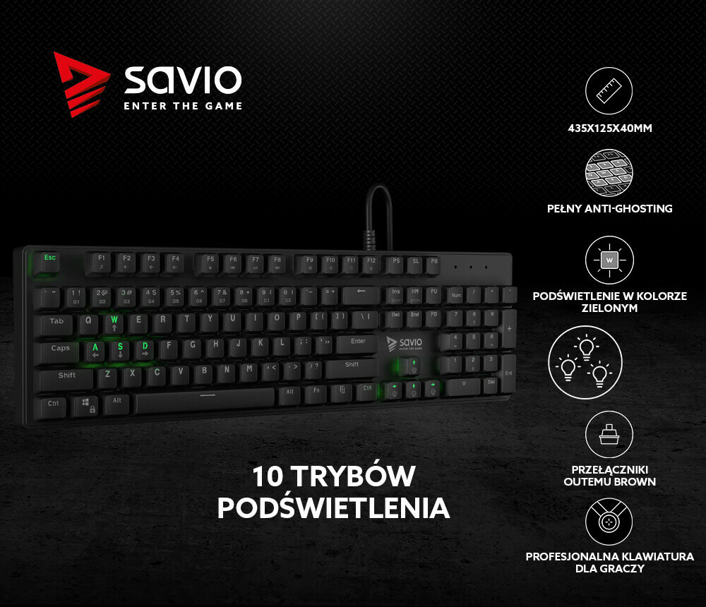 Mechaniczna Klawiatura Gamingowa SAVIO Tempest RX FULL Outemu BROWN jest to pełna klawiatura z blokiem numerycznym. Posiada 104 nieścieralne przyciski wyprodukowanych metodą „double incjection”.
