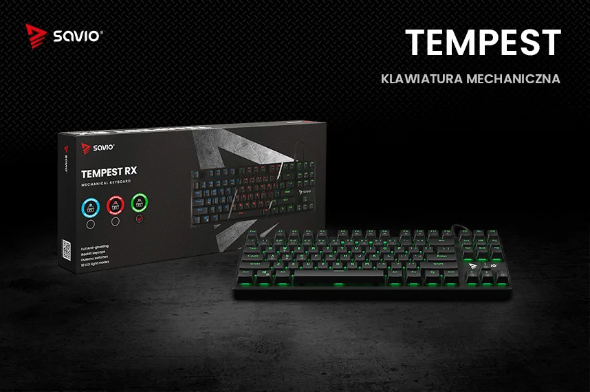 Z myślą o profesjonalnych graczach Mechaniczna Klawiatura SAVIO TEMEPST RX – TKL (tenkeyless) jest klawiaturą turniejową bez bloku numerycznego. Posiada 87 nieścieralnych przycisków wyprodukowanych metodą „double incjection”.