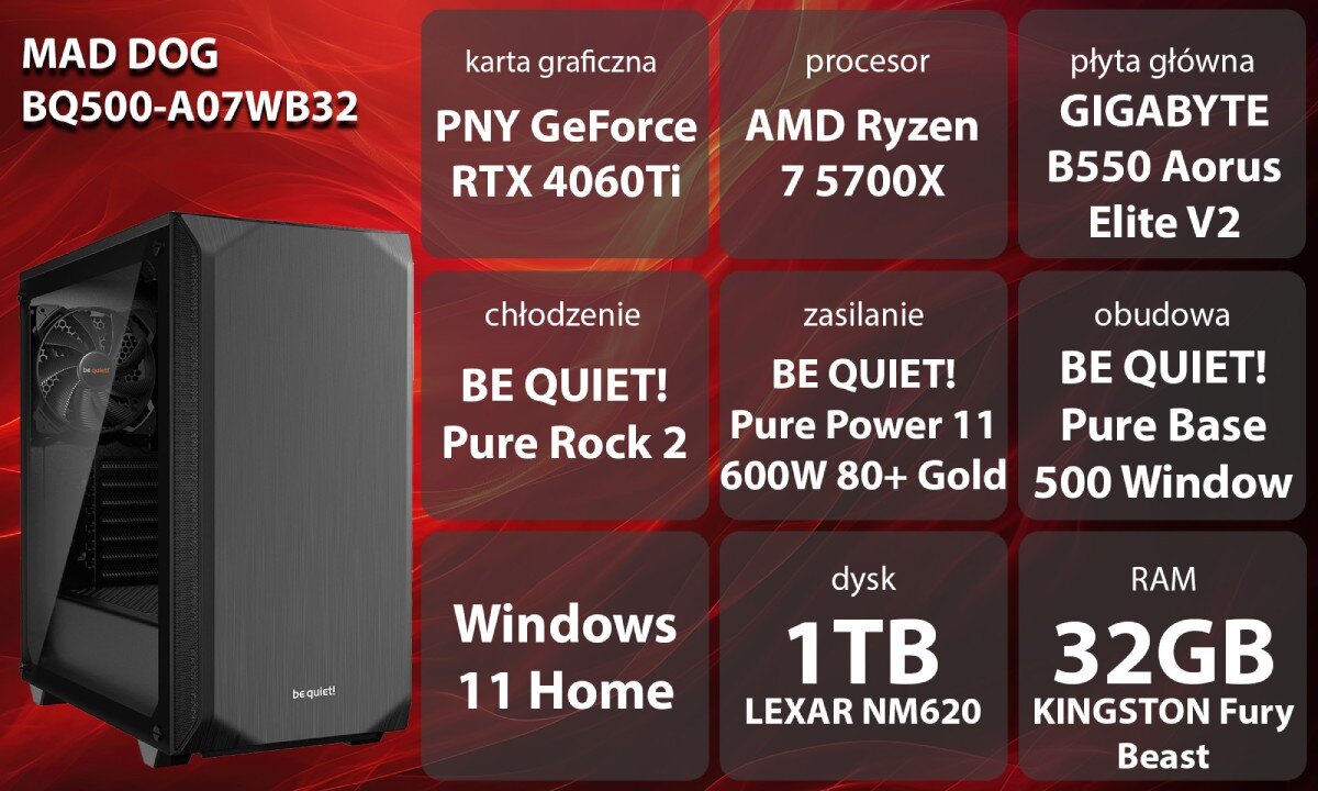 - Komputer MAD DOG BQ500-A07WB32 R7-5700X 32GB RAM 1TB SSD GeForce RTX4060Ti DLSS 3 Windows 11 Home