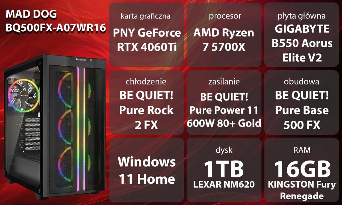 - Komputer MAD DOG BQ500FX-A07WR16 R7-5700X 16GB RAM 1TB SSD GeForce RTX4060Ti DLSS 3 Windows 11 Home