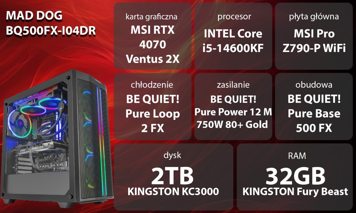 - Komputer MAD DOG GeForce RTX4070 CS2 Reflex Edition BQ500FX-I04DR i5-14600KF 32GB RAM 2TB SSD Wi-Fi