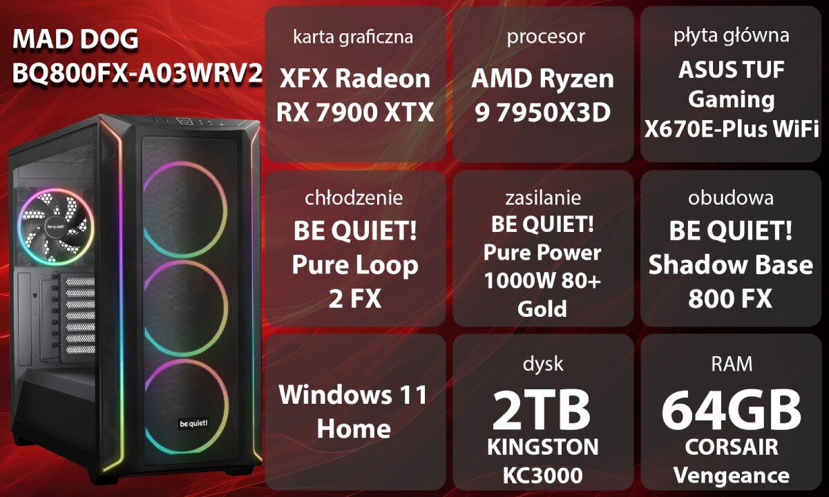 Komputer MAD DOG BQ800FX-A03WRV2 R9-7950X3D 64GB RAM 2TB SSD Radeon RX7900XTX Wi-Fi Windows 11 Home