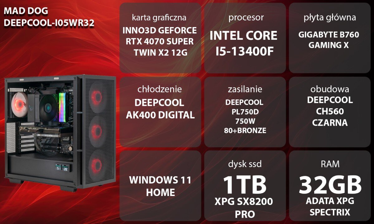 - Komputer MAD DOG DEEPCOOL-I05WR32 i5-13400F 32GB RAM 1TB SSD GeForce RTX4070 Super DLSS 3 Windows 11 Home