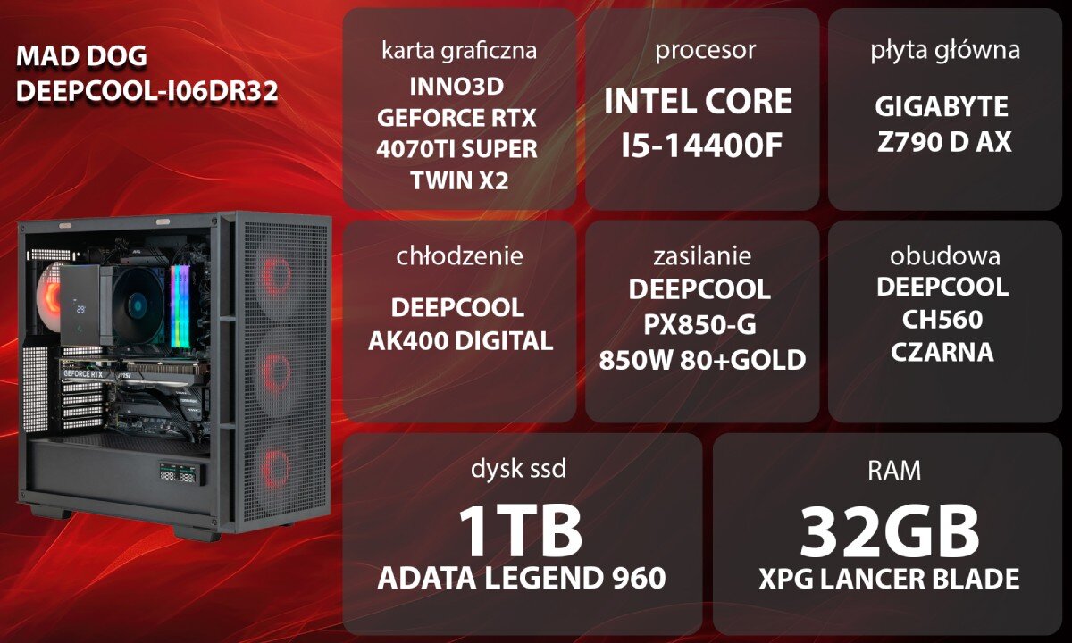 - Komputer MAD DOG DEEPCOOL-I06DR32 i5-14400F 32GB RAM 1TB SSD GeForce RTX4070Ti Super DLSS 3 Wi-Fi