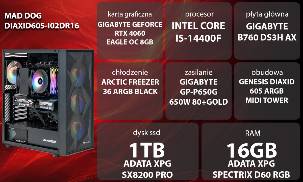 - Komputer MAD DOG DIAXID605-I02DR16 i5-14400F 16GB RAM 1TB SSD GeForce RTX4060 DLSS 3 Wi-Fi