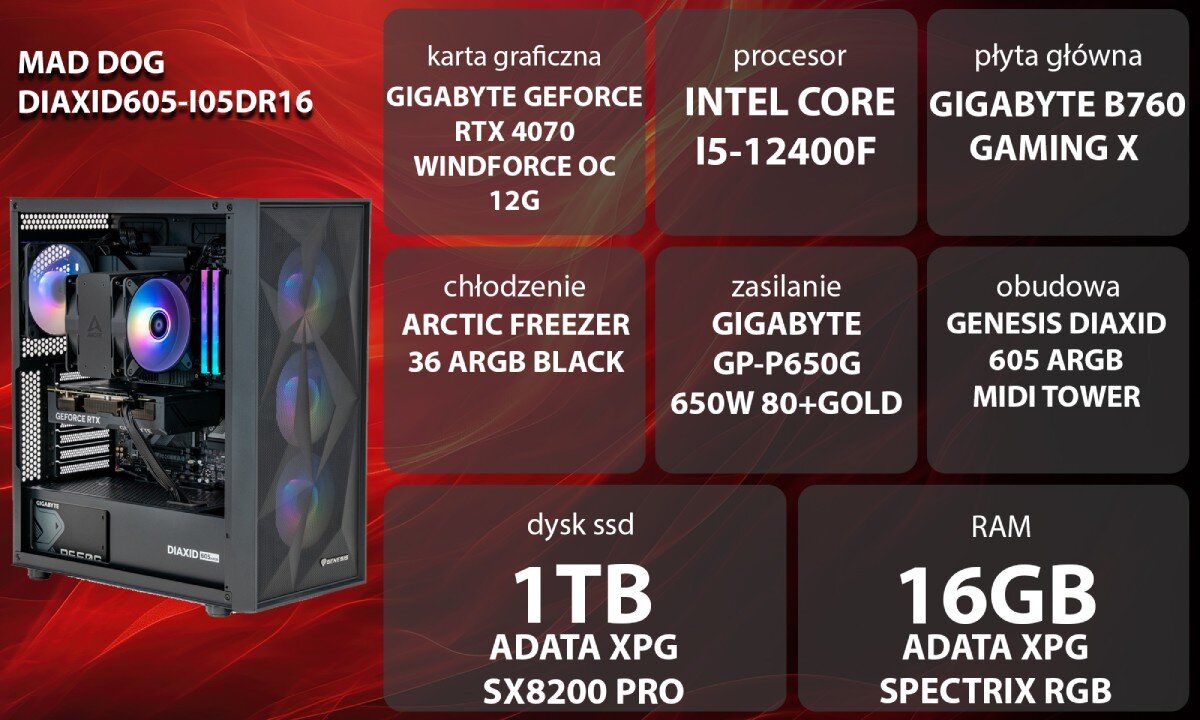 - Komputer MAD DOG DIAXID605-I05DR16 i5-12400F 16GB RAM 1TB SSD GeForce RTX4070 DLSS 3