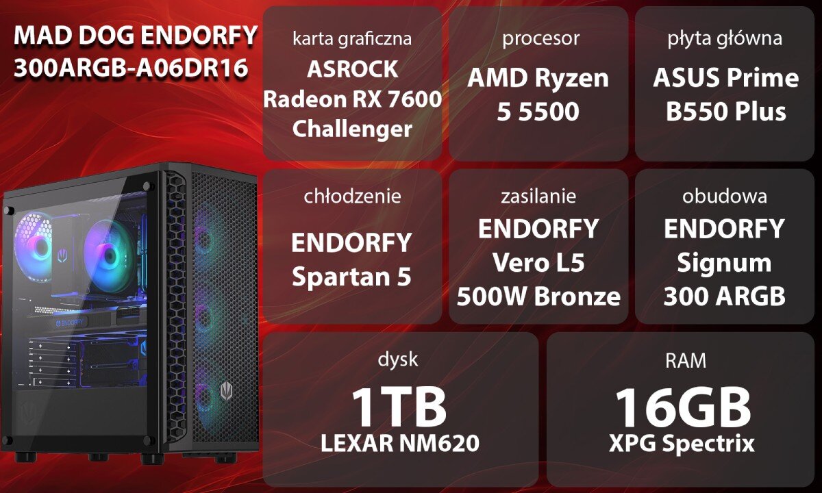 Komputer MAD DOG ENDORFY300ARGB-A06DR16 R5-5500 16GB RAM 1TB SSD Radeon RX7600