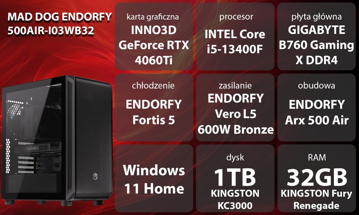 - Komputer MAD DOG ENDORFY500AIR-I03WB32 i5-13400F 32GB RAM 1TB SSD GeForce RTX4060Ti/16 DLSS 3 Windows 11 Home