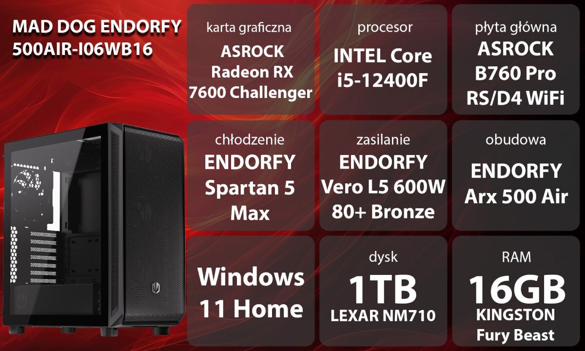 Komputer MAD DOG ENDORFY500AIR-I06WR16 i5-12400F 16GB RAM 1TB SSD Radeon RX7600 Wi-Fi Windows 11 Home