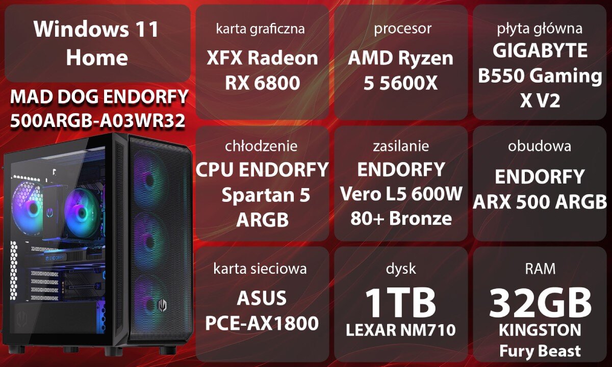 - Komputer MAD DOG ENDORFY500ARGB-A03WR32 R5-5600X 32GB RAM 1TB SSD Radeon RX6800 Wi-Fi Windows 11 Home