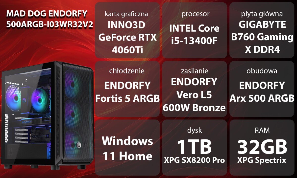- Komputer MAD DOG ENDORFY500ARGB-I03WR32V2 i5-13400F 32GB RAM 1TB SSD GeForce RTX4060Ti/16 DLSS 3 Windows 11 Home