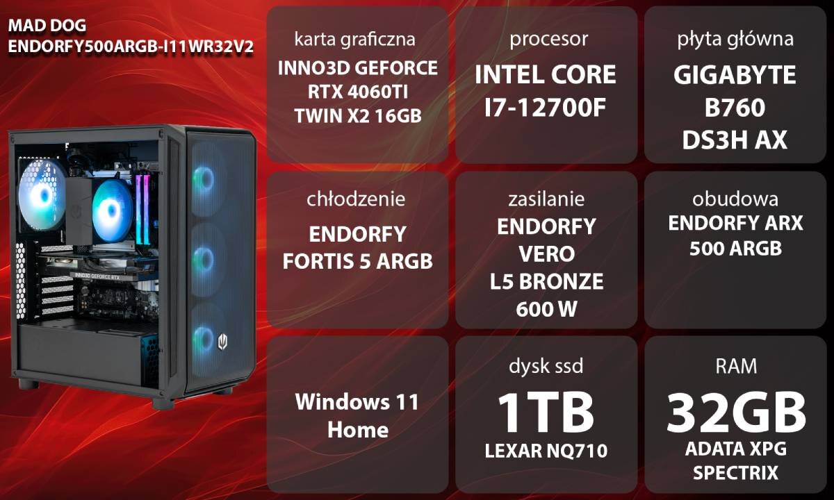 - Komputer MAD DOG ENDORFY500ARGB-I11WR32 i7-12700F 32GB RAM 1TB SSD GeForce RTX4060Ti DLSS 3 Wi-Fi Windows 11 Home