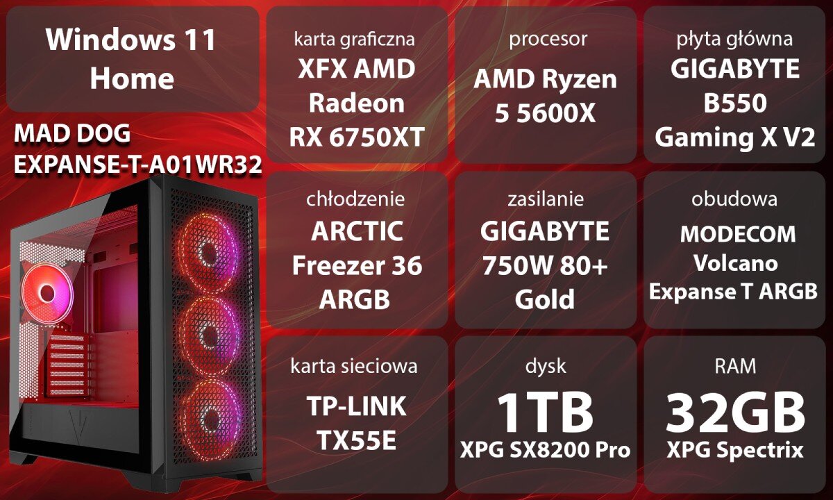 - Komputer MAD DOG EXPANSE-T-A01WR32 R5-5600X 32GB RAM 1TB SSD Radeon RX6750XT Wi-Fi Windows 11 Home