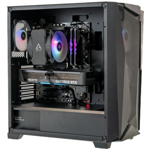 Całość zamknięta jest w obudowie GIGABYTE C301 Glass, która jest odzwierciedleniem mocy tej konfiguracji. Konstrukcja z panelami wentylacyjnymi oraz podświetlanymi wentylatorami dostarcza odpowiednią cyrkulację powietrza. Dodatkowo filtry przeciwkurzowe ułatwiają utrzymanie wnętrza obudowy w czystości, a panel boczny z hartowanego szkła pozwala na podziwianie wnętrza komputera. Natomiast łatwy dostęp do dwóch portów USB-A 3.2 Gen. 1, jednego USB-C 3.2 Gen. 1 oraz wejścia i wyjścia audio dopełnia funkcjonalność obudowy.