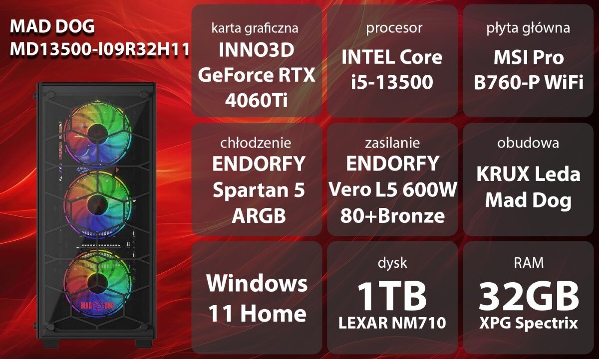 - Komputer MAD DOG MD13500-I09R32H11 i5-13500 32GB RAM 1TB SSD GeForce RTX4060Ti DLSS 3 Wi-Fi Windows 11 Home