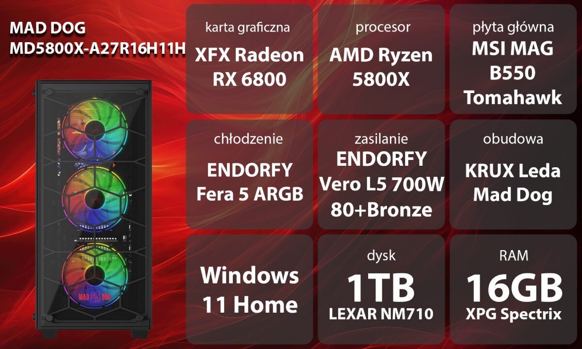 - Komputer MAD DOG MD5800X-A27R16H11 R7-5800X 16GB RAM 1TB SSD Radeon RX6800 Windows 11 Home