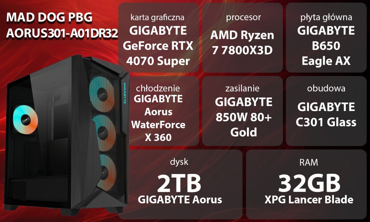 Komputer MAD DOG Powered by Gigabyte AORUS301-A01DR32 R7-7800X3D 32GB RAM 2TB SSD GeForce RTX4070 Super Wi-Fi