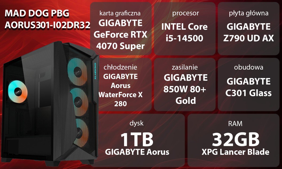 - Komputer MAD DOG Powered by Gigabyte AORUS301-I02DR32 i5-14500 32GB RAM 1TB SSD GeForce RTX4070 Super Wi-Fi