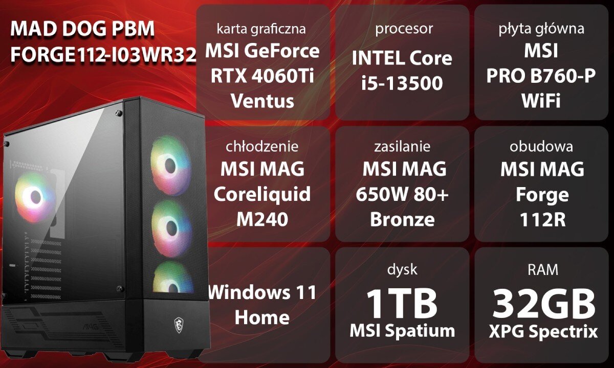 - Komputer MAD DOG Powered by MSI FORGE112-I03WR32 i5-13500 32GB RAM 1TB SSD GeForce RTX4060Ti DLSS 3 Wi-Fi Windows 11 Home