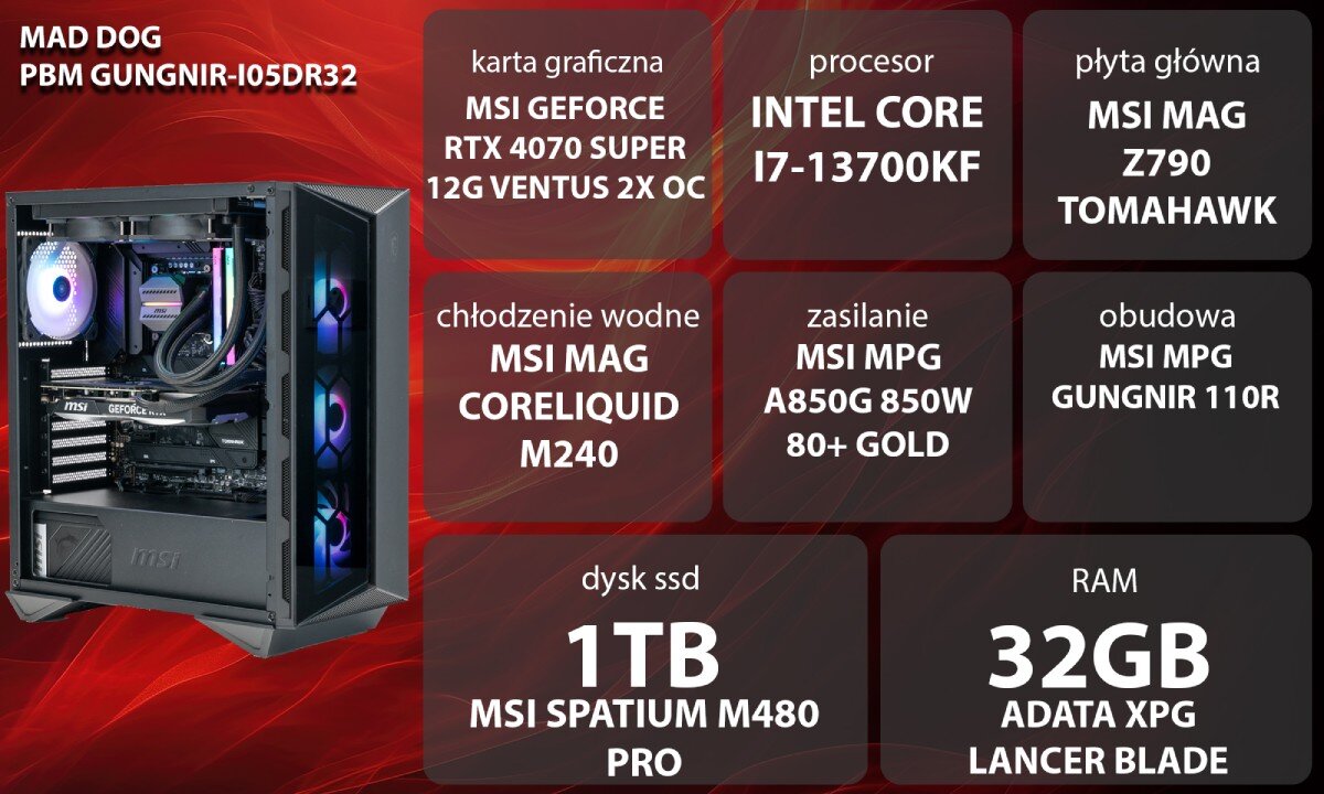 - Komputer MAD DOG Powered by MSI GUNGNIR-I05DR32 i7-13700KF 32GB RAM 1TB SSD GeForce RTX4070 Super DLSS 3 Wi-Fi