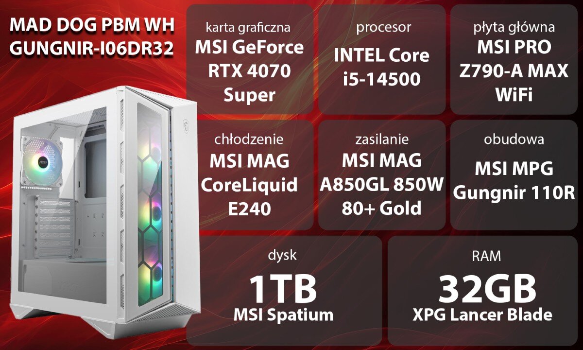 - Komputer MAD DOG Powered by MSI WH GUNGNIR-I06DR32 i5-14500 32GB RAM 1TB SSD GeForce RTX4070 Super Wi-Fi