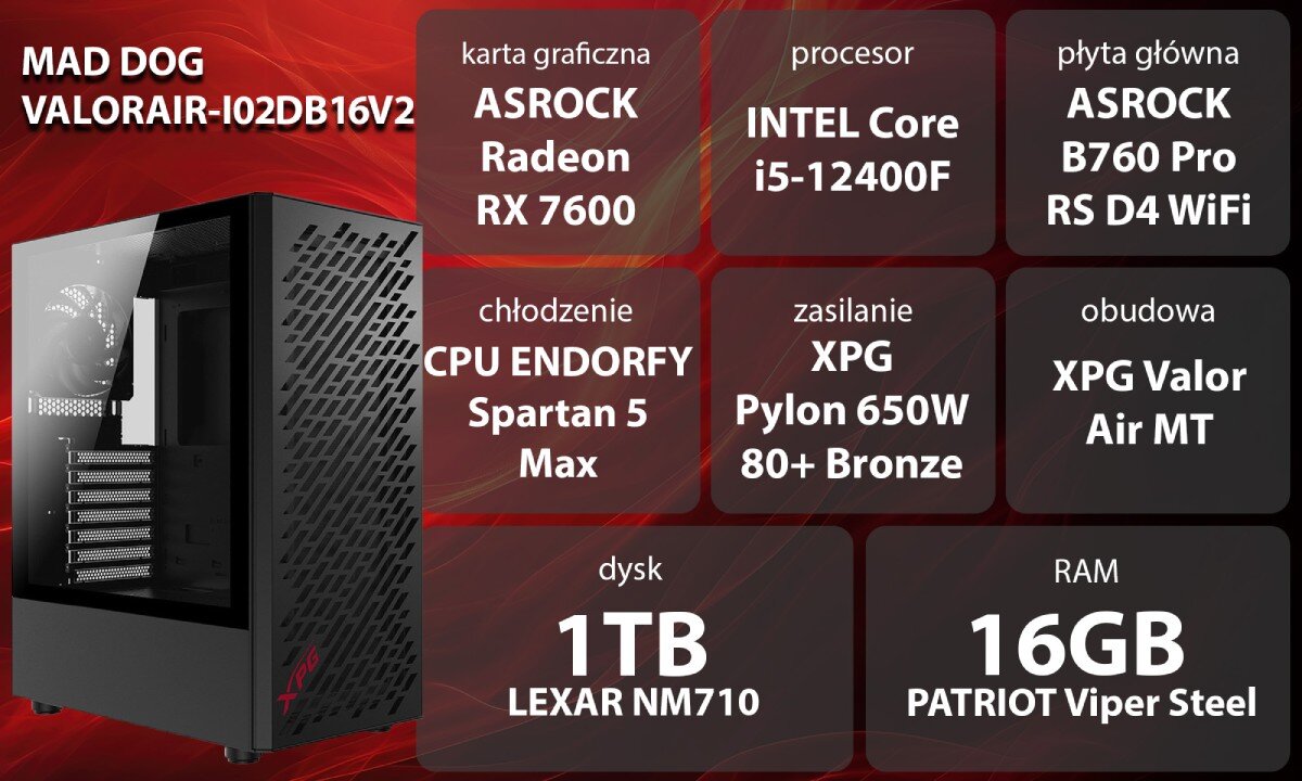 - Komputer MAD DOG VALORAIR-I02DB16V2 i5-12400F 16GB RAM 1TB SSD Radeon RX7600 Wi-Fi
