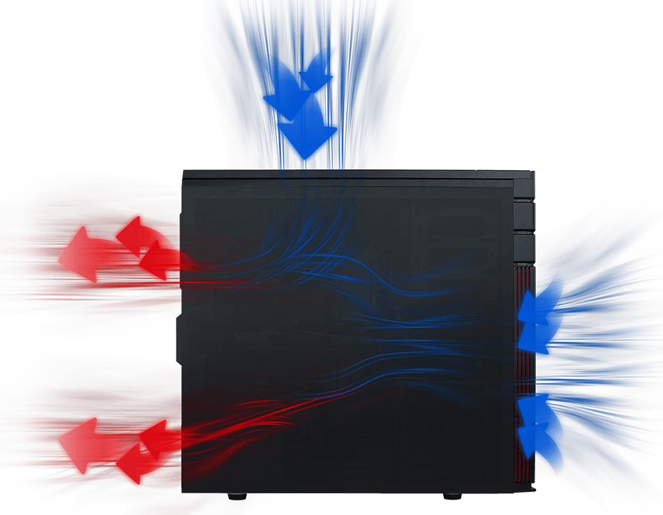 Obieg powietrza w obudowie komputera Codex 3 Na obudowie komputera Codex 3, wydzielono duże obszary, przez które do jego środka wlatuje chłodne powietrze z otoczenia. Dzięki temu podzespoły Codex 3 są efektywnie chłodzone, a cały pecet charakteryzuje się niskim poziomem generowanego hałasu. Poza tym, w obudowie Codex 3 znajdziemy dużą przestrzeń, która pozwala na bezproblemowe zamontowanie dodatkowych wentylatorów. W ten sposób zwiększyć można wydajność komputera, eliminując możliwość przegrzewania się jego podzespołów. |