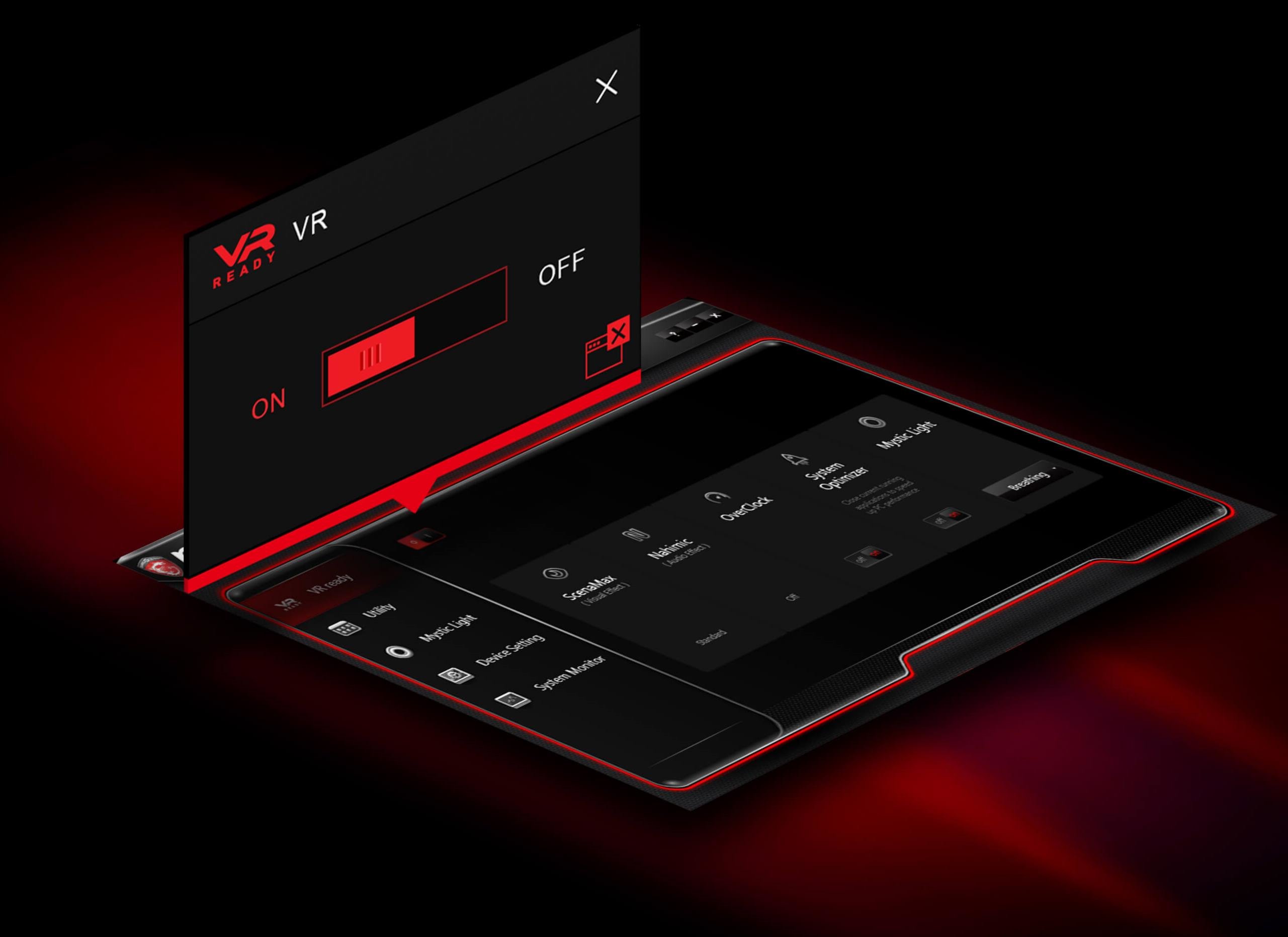 Zarówno sprzęt, jak i oprogramowanie muszą być odpowiednio dopasowane do tego, aby wirtualna rzeczywistość była generowana w płynny sposób. Zaimplementowana w aplikacji MSI Gaming Center, funkcja One Click to VR sprawia, że bardzo szybko i łatwo można dostroić sprzęt do pracy w środowisku VR. Jedno kliknięcie sprawia, że wszystkie kluczowe komponenty komputera zostają przestawione w tryb ich najwyższej wydajności i jednocześnie gwarantuje, że inne aplikacje nie będą wpływać na wirtualną przygodę.