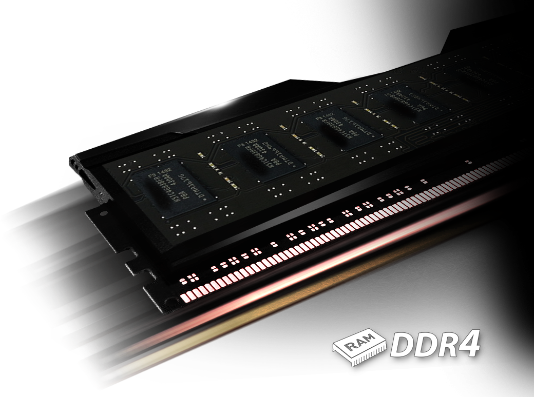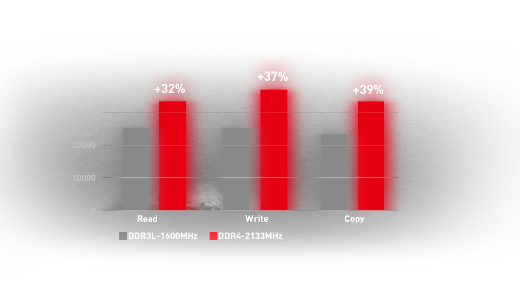 | OBSŁUGA PAMIĘCI DDR4 Nowa architektura procesorów Intel® Core ™, przystosowana została do obsługi pracujących z dużą szybkością modułów pamięci DDR4 2133 MHz. Dwukanałowa obsługa pamięci DDR4-2133 pozwala na 33% zwiększenie wydajności w porównaniu z dwukanałową obsługą pamięci DDR3-1600. |