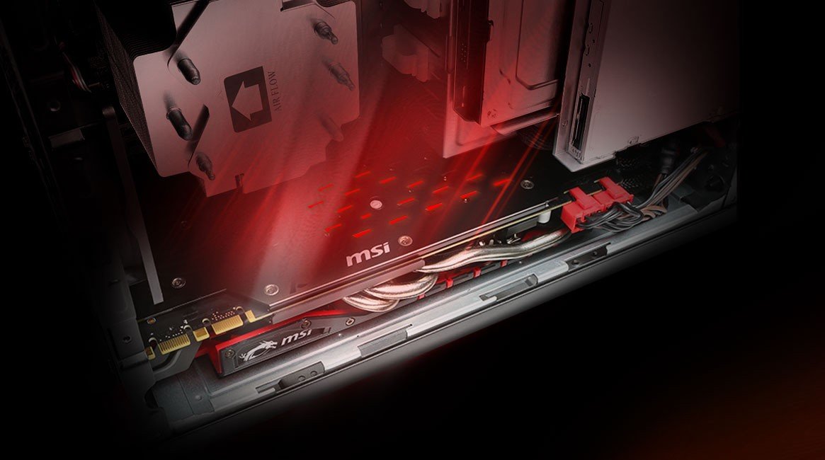 Chłodne powietrze zasysane jest do wnętrza komputera przez otwory wentylacyjne umieszczone z przodu i na spodzie obudowy. W przeciwieństwie do standardowych, montowanych w tradycyjnych obudowach wentylatorów o prędkości obrotowej 400-1200 obr./min, siedem olbrzymich łopatek wentylatora MSI Dragon Fan może wytworzyć niesamowicie wysokie ciśnienie tłoczonego powietrza przy prędkości maksymalnej dochodzącej do 3600 obr./min.