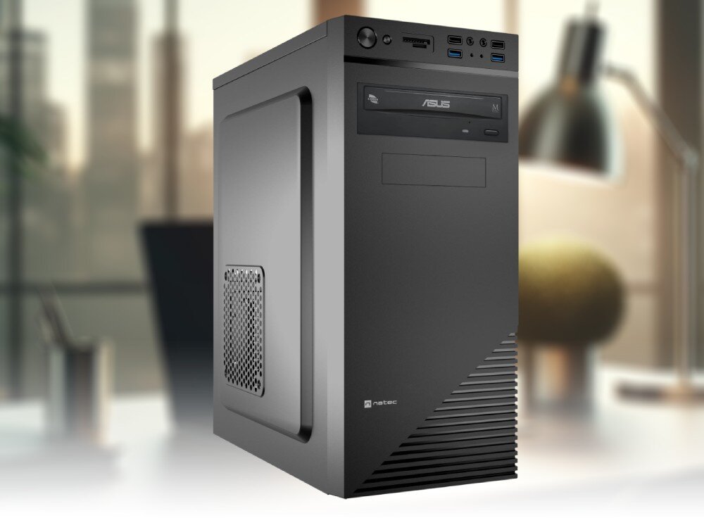 XQUANTUM XQR5R8S500-XA10W11H został zaprojektowany z myślą o estetyce i praktyczności, co widoczne jest w obudowie NATEC Cabassu G2 o prostych kształtach i czarnym kolorze. Z przodu znajdują się cztery porty USB-A, w tym dwa szybkie porty USB 3.0 dla szybkiego transferu danych. Do wykorzystania masz też czytnik kart SD i MicroSD oraz napęd ASUS DRW-24D5MT, które umożliwiają zgrywanie i odczyt plików z różnych nośników również z płyt CD i DVD. Zapewniona została również odpowiednia wentylacja dzięki 80-milimetrowemu wentylatorowi.