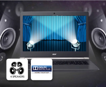 Dzięki zaawansowanym technologiom audio, Aspire V Nitro sprawi, że poczujesz się jak w prawdziwym kinie. Cztery wbudowane głośniki zsynchronizowane z systemem Dolby® Digital Plus Home Theater™ dostarczą Ci dźwięk w trybie surround o mocy 8 W, który możesz dowolnie dostosować w zależności od rodzaju filmu lub innych potrzeb za pomocą prostego w obsłudze interfejsu Dolby®.