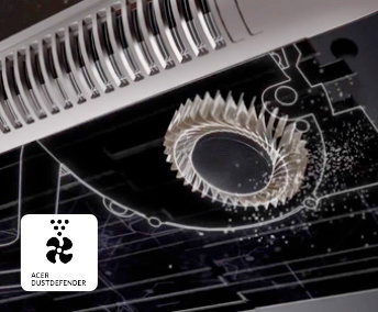 Skonstruowane z lekkiego i trwałego metalu łopatki wentylatora Acer DustDefender stanowią genialny mechanizm usuwania kurzu. Dzięki olbrzymiej prędkości obrotowej znacznie usprawniają odprowadzanie ciepła z komponentów. Poprzez usuwanie kurzu i utrzymywanie obniżonej temperatury, Acer DustDefender zwiększa żywotność produktu, zmniejsza hałas pracy urządzenia i zapewnia większy komfort użytkownika, umożliwiając nieprzerwaną pracę.