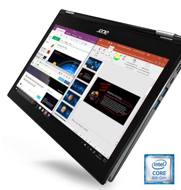 Wszystko działa szybciej i bardziej płynnie z pomocą procesorów Intel® Core 8. generacji, dzięki którym wydajność Twojego sprzętu wzrośnie nawet do 40%.1