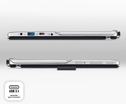 Szereg zastosowań tego urządzenia 2 w 1 można z łatwością rozszerzyć o zewnętrzne urządzenia poprzez port USB 3.1 typu-CTM. Ten niezwykły port pozwala na trasfer danych z ogromną szybkością i wyświetlanie plików wideo wysokiej jakości bez zakłóceń. Możesz też wykorzystać port do ładowania innych urządzeń, takich jak smartfony.