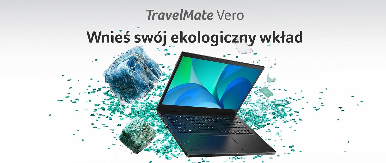 Laptop ACER TravelMate Vero został wykonany z materiałów pochodzących z recyklingu, co przekłada się na zmniejszenie jego negatywnego wpływu na środowisko. Obudowa i ramka ekranu składają się w 30% z tworzywa sztucznego PCR, a klawisze aż w 50%. Jest to pionierska konstrukcja będąca krokiem na drodze do budowania laptopów w całości z tworzyw PCR.