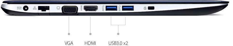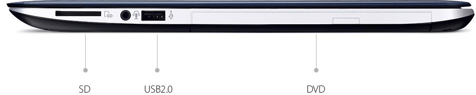 Notebook ASUS z serii X oferuje szeroki wachlarz opcji połączeń, które obejmują porty USB 3.0, HDMI i VGA, czytnik kart SD/SDHC/SDXC 3-w-1 oraz inne, co zapewnia kompatybilność z różnymi urządzeniami peryferyjnymi, a technologia USB 3.0 zapewnia dziesięciokrotnie większą prędkość transferu danych niż USB 2.0. Teraz możesz przesyłać zdjęcia, muzykę, a nawet duże pliki wideo w mgnieniu oka - przeniesienie 25 GB pliku Blu-ray trwa zaledwie 70 sekund.