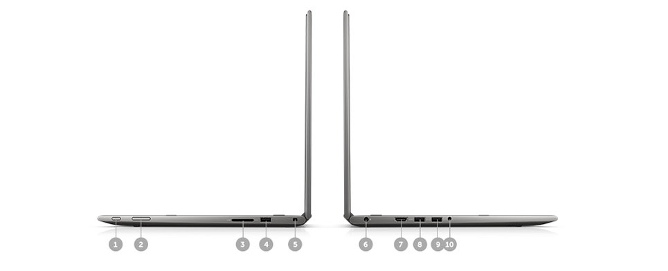 1. Przycisk zasilania | 2. Sterowanie głośnością | 3. Czytnik kart pamięci SD | 4. USB 2.0 | 5. Gniazdo blokady Noble | 6. Wejście prądu stałego | 7. HDMI | 8. USB 3.0 | 9. USB 3.0 | 10. Gniazdo audio