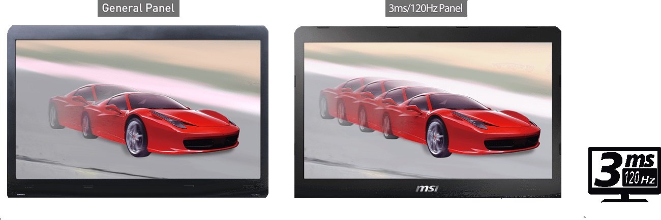 Gamingowe laptopy MSI, to jedyne notebooki do gier, w których zastosowano ekrany ze 120-hercową częstotliwością odświeżania i 3-milisekundowym czasem odpowiedzi matrycy. Dzięki temu notebook firmy MSI staje się towarzyszem, na którym zawsze można polegać tak, aby nigdy nie stracić szczegółów obrazu podczas dynamicznych gier. Wysoki poziom realizmu generowanego obrazu wynika z możliwości technicznych panelu pozwalających wyświetlać do 120 ramek obrazu na sekundę. 94-procentowe pokrycie przestrzeni barwnej NTSC sprawia, że uzyskane na ekranie kolory są wyjątkowo żywe i czyste, a wyświetlany obraz krystaliczny.Dane techniczne