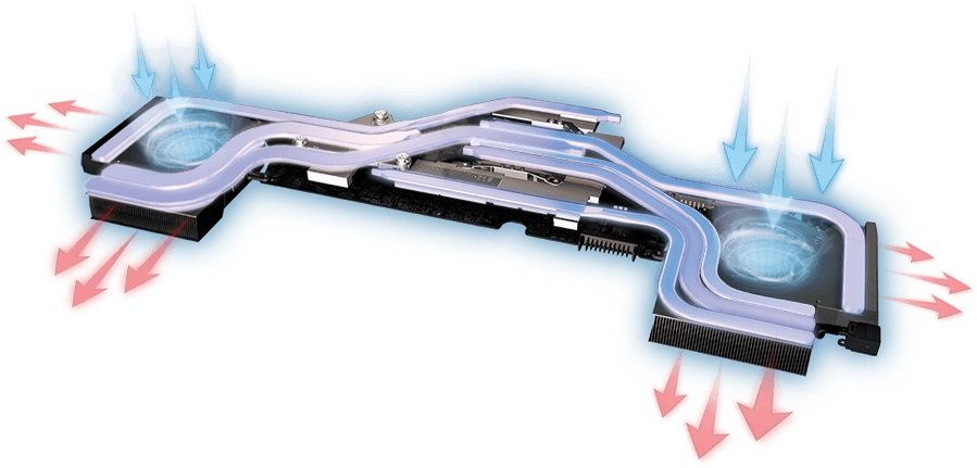 Najnowszy, rewolucyjny system chłodzący, MSI Cooler Boost 5, wyróżnia się tym. że zastosowano w nim dwa moduły chłodzenia. Dzięki dwóm wentylatorom Whirlwind Blade współpracującym z 7 ciepłowodami, z których ciepło za pomocą strumienia powietrza odprowadzane jest na zewnątrz obudowy w czterech kierunkach, zapewniono wyjątkowo wydajne i intensywne chłodzenie wszystkich kluczowych podzespołów notebooka. System ten zapewnia najwyższy poziom odprowadzania ciepła, jaki spotkać można w tego rodzaju urządzeniach. Technologia ta została zaprojektowana specjalnie pod kątem współpracy z układami graficznymi z serii GTX 1070 pozwalając im pracować z większą wydajnością i niższą temperaturą.