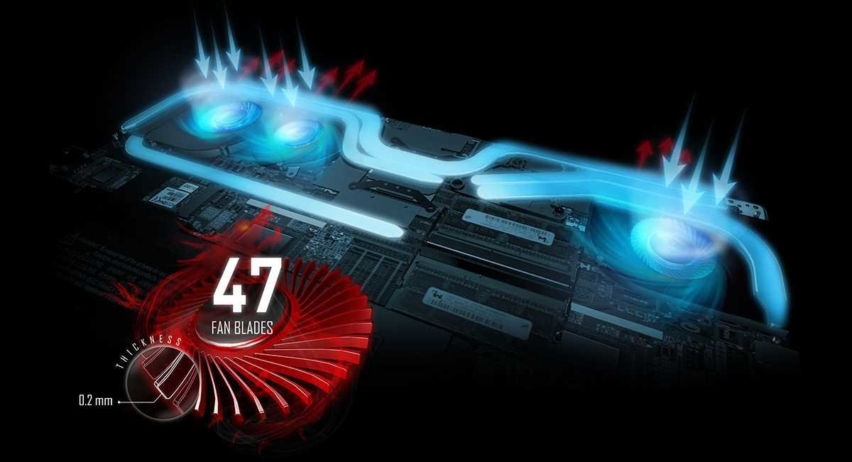 System chłodzący Cooler Boost Trinity, to system, który składa się z trzech usprawnionych konstrukcyjnie wentylatorów Whirlwind Blade, gdzie liczbę łopatek podniesiono do 47. Dzięki temu, efektywnie zwiększono przepływ tłoczonego powietrza o 45% i jego ciśnienie o 14%, przy zachowaniu tej samej prędkości obrotowej wentylatora. Niezależne od siebie podsystemy chłodzenia dla procesora i układu graficznego, które wykorzystują łącznie 5 ciepłowodów, gwarantują, że ciepło sprawnie odprowadzane jest z procesora i układu graficznego, dzięki czemu mogą one pracować z pełną wydajnością nawet w najbardziej wymagających grach.