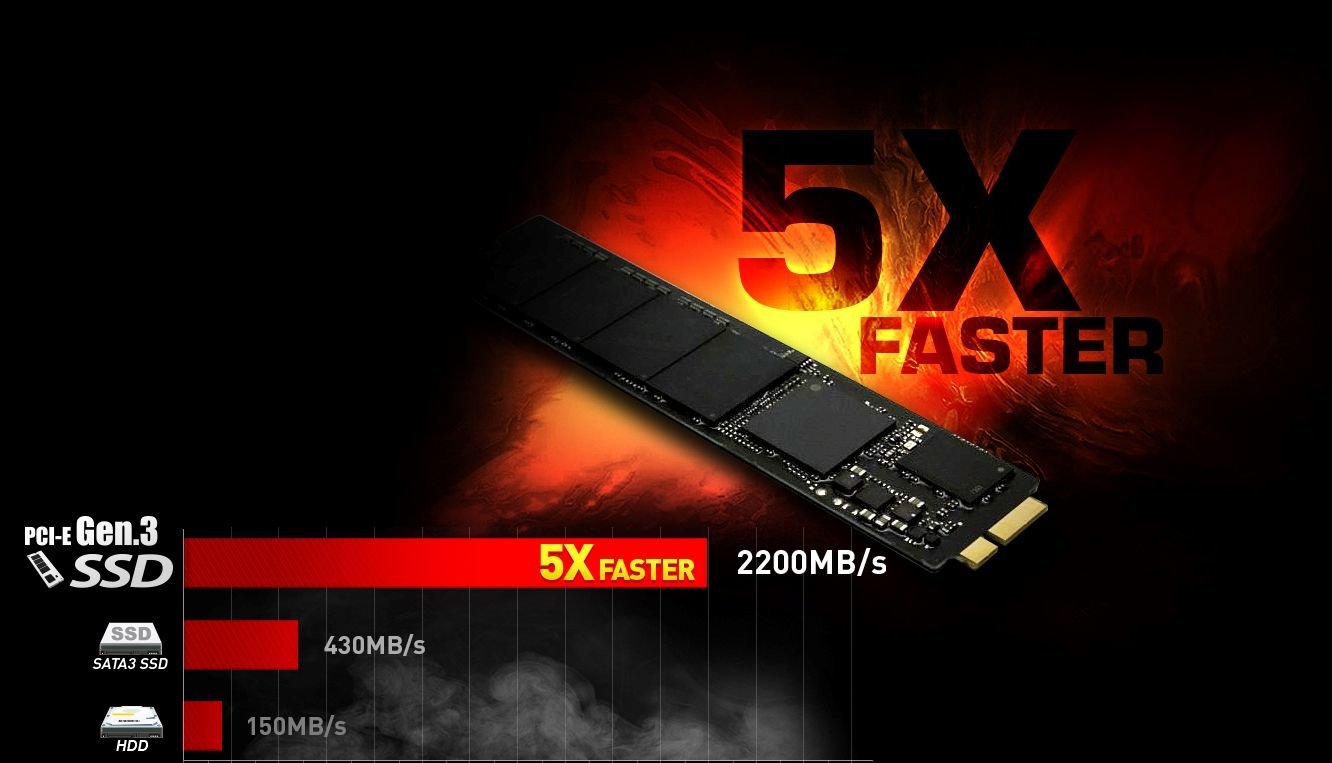 Wejdź do gry, zanim zrobią to inni. Szybkie załadowanie i uruchomienie gry jest możliwe, za sprawą najnowszego systemu pamięci masowej, który korzysta, w wypadku zamontowania w notebooku pojedynczego dysku SSD M.2, z przepustowości magistrali PCI-E Gen3 x4 i technologii NVMe. W ten sposób, spożytkować można pełny potencjał, który oferowany jest przez zgodne ze standardem PCI-E Gen 3.0 napędy SSD. Dzięki zastosowaniu sprzętowo-programowej optymalizacji wydajności, możliwe stało się osiągnięcie ekstremalnych prędkości odczytu, dochodzących do 2200 MB/s, czyli dane odczytywane są 5x szybciej, niż w wypadku napędów SSD SATA3.