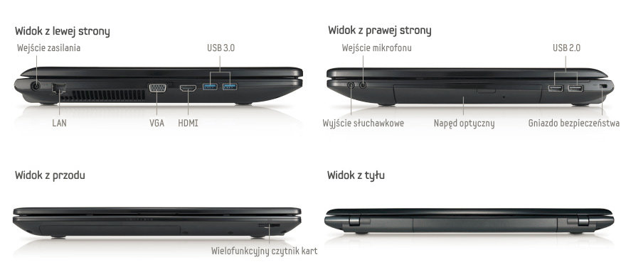 Szybko przesyłaj dane między notebookiem a zewnętrznymi urządzeniami z prędkością nawet do 5 Gb/s przez port USB 3.0, dziesięciokrotnie szybszy niż standardowy. Ponadto porty HDMI i VGA umożliwiają łatwe podłączenie do nowoczesnego telewizora lub dużego monitora, pozwalając na oglądanie filmów i zdjęć na znacznie większym ekranie.