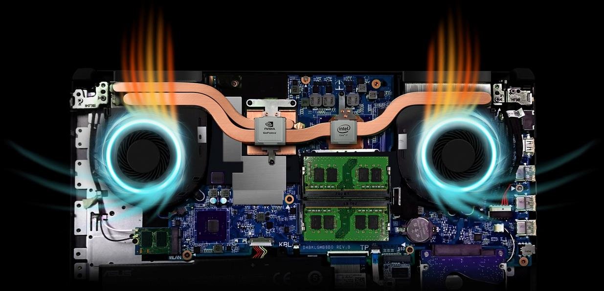 Zastosowany w laptopie FX504 system chłodzenia znacznie wydłuża jego żywotność i zapewnia stabilną wydajność nawet podczas najbardziej intensywnej rozgrywki – m.in. dzięki technologii HyperCool łączącej opatentowany system samooczyszczania ADC z funkcją Fan Overboost. System ADC usuwa kurz z obudowy komputera przez dwa dedykowane tunele i działa na zasadzie centralnego systemu obronnego komputera – zapobiega gromadzeniu się pyłu na żebrach radiatorów, przez co zwiększa stabilność pracy oraz wydłuża żywotność urządzenia. Natomiast funkcja Fan Overboost umożliwia dostosowanie prędkością wentylatorów do charakteru wykonywanych zadań. Podwójny układ rurek cieplnych i wentylatorów osobno chłodzi procesor i kartę graficzną, zaś specjalnie zaprojektowana obudowa zapewnia lepszy przepływ powietrza, zwiększając efektywność systemu chłodzenia nawet o 27% w porównaniu do standardowych konstrukcji. FX504 zaprojektowano z myślą o graczach - jeden z wentylatorów umiejscowiliśmy tuż pod grupą klawiszy WASD, by zapewnić komfort użytkowania nawet podczas najdłuższej rozgrywki.