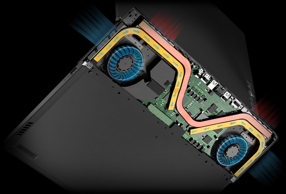 Urządzenie wyposażone jest w dwukanałowy system chłodzenia, który zapewnia liczne korzyści, takie jak indywidualne chłodzenie układów CPU i GPU w celu obniżenia temperatury systemu, cztery wentylatory optymalizujące przepływ powietrza i 70 indywidualnych łopatek wentylatora na kanał, które wyciszają system.